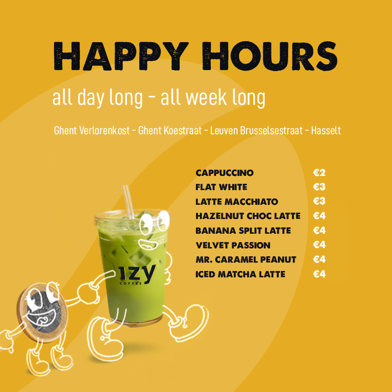 *The promotion cannot be combined with other promotions. You can pay with your loyalty card during this promotion, but you won’t receive the additional €1 Loyalty Card Discount. Promotion valid in IzyCoffee Ghent Verlorenkost, Ghent Koestraat, Leuven Brusselsestraat, and Hasselt.
