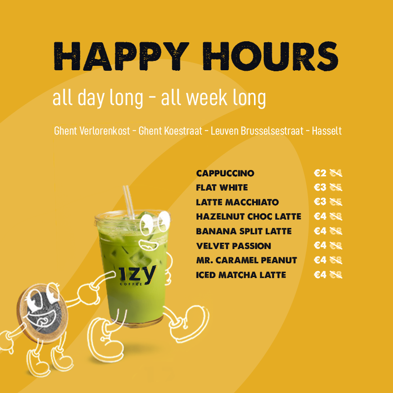 *The promotion cannot be combined with other promotions. You can pay with your loyalty card during this promotion, but you won’t receive the additional €1 Loyalty Card Discount. Promotion valid in IzyCoffee Ghent Verlorenkost, Ghent Koestraat, Leuven Brusselsestraat, and Hasselt.